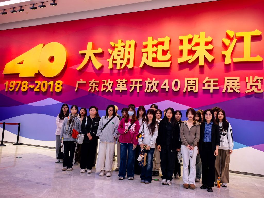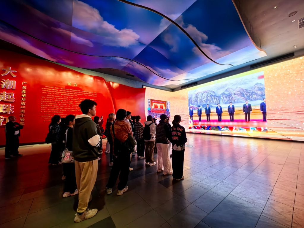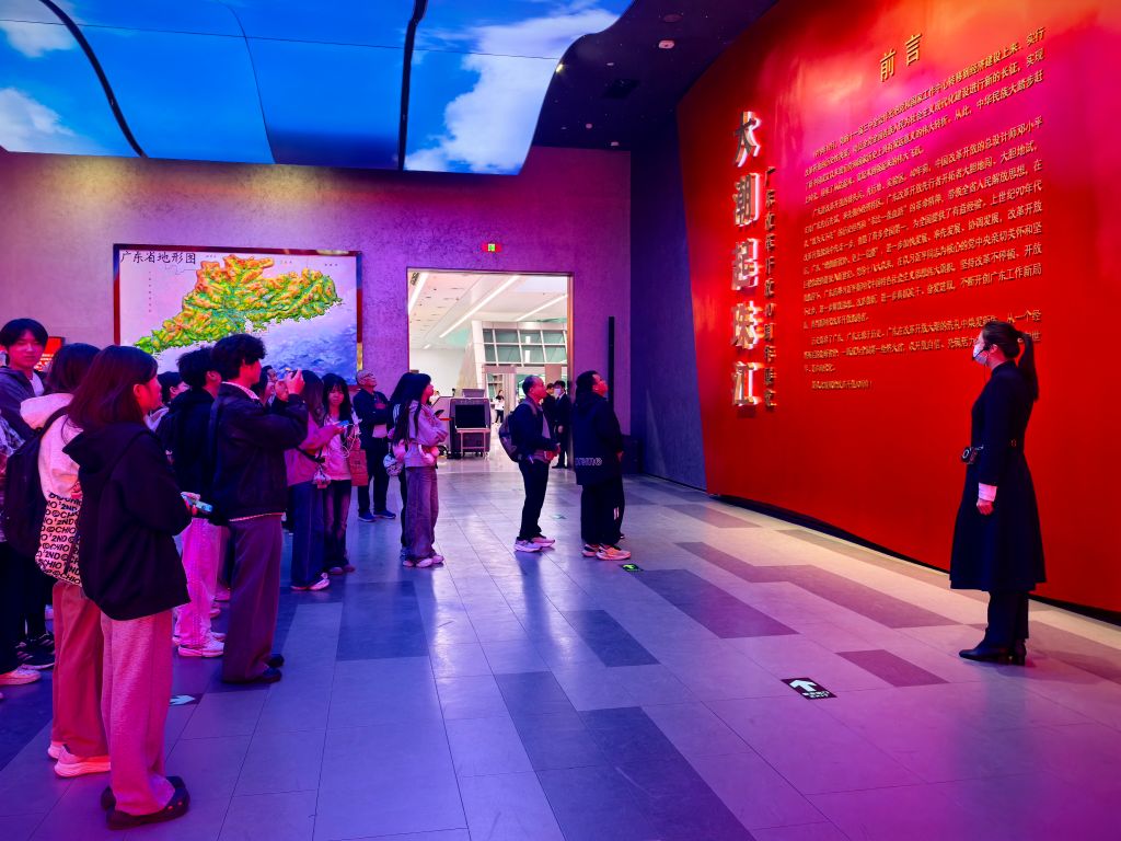 在讲解员引导下,师生系统参观了“大潮起珠江-广东改革开放40周年展览”。展览以丰富史料、实物与多媒体形式,生动展现了广东改革开放40年的壮阔历程和辉煌成就。从序厅的主题巨墙,到“敢为人先 勇立潮头”“增创优势 砥砺前行”“走在前列 当好窗口”等展区,师生在历史场景中重温改革足迹,深入理解“解放思想、实事求是”的思想路线,体会“时间就是金钱,效率就是生命”的时代内涵,感悟新时代广东在创新驱动与粤港澳大湾区建设中的战略实践。